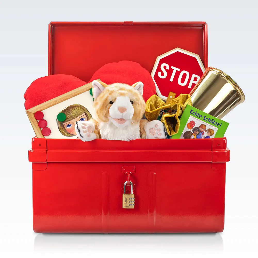 Die Kisten enthalten zahlreiche Materialien wie ein Gefühle-Herz aus Plüsch, Geheimnis-Säckchen, Körpertafeln mit Magneten, ein Megafon, eine Stoppkelle sowie die Handpuppe „Katze Kim“. Gemeinsam mit dem Bilderbuch ECHTE SCHÄTZE und einem begleitenden Arbeitshandbuch können die Erzieherinnen und Erzieher wichtige Präventionsbotschaften altersgerecht an die Vorschulkinder vermitteln. Im Mittelpunkt stehen die Stärkung des Selbstwertgefühls und der Aufbau eines positiven Selbstkonzepts.